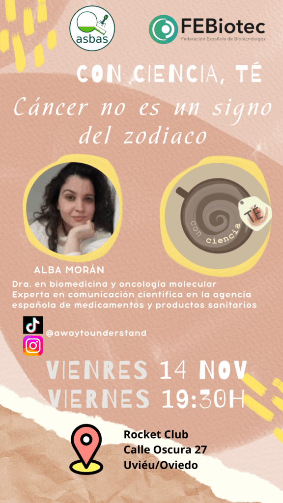 Alba Morán es dra. en Biomedicina y Oncología Molecular. Experta en comunicación científica. Actualmente trabaja en la Agencia Española de Medicamentos y Productos Sanitarios. Puedes seguirla en Instagram o TikTok (@awaytounderstand). Su charla Cáncer no es un signo del zodiaco será una maravilla. Ya es una veterana en el Con Ciencia, té, así que… ¡aconsejamos que no te la pierdas!