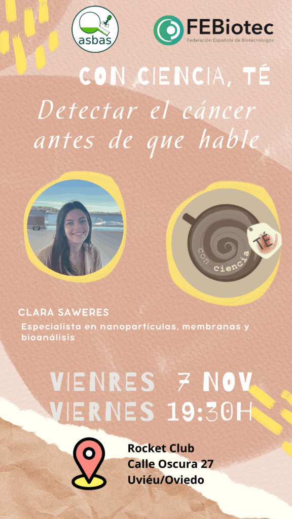 Clara Saweres es estudiante de doctorado en el Dpto. de Química Física y Analítica de la Universidá d’Uviéu/Oviedo. El título de su charla es: Detectar el cáncer antes de que hable. Todos deseamos que permanezca callado para siempre pero, por si acaso, hay que estar preparados. ¿Te lo vas a perder? El resumen de su charla es:
