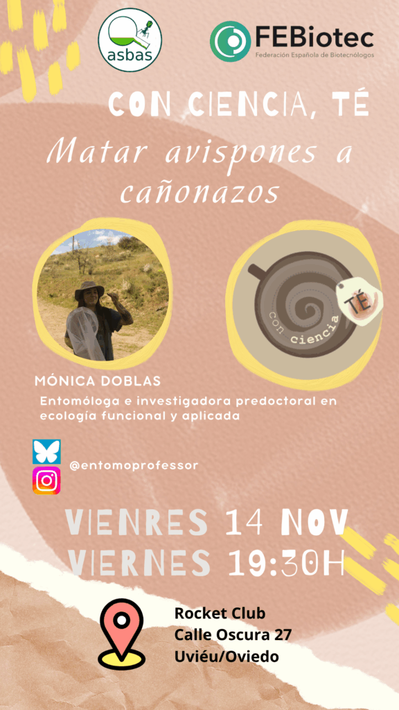 Soy Mónica Doblas, investigadora predoctoral en ecología funcional y aplicada. Mi trabajo se centra en el avispón asiático, estudiando su estructura genética poblacional y evaluando cómo las distintas estrategias de control influyen en la dinámica y estabilidad de los ecosistemas.