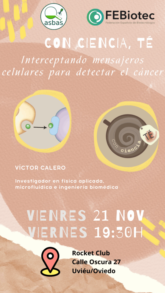 Víctor Calero es investigador postdoctoral en el departamento de Física Aplicada, Microfluídica e Ingeniería Biomédica en la Universidá d’Uviéu/Oviedo —casi nada. Nos deleitará con una exposición sobre los mensajeros celulares y el cáncer, que no debes perderte.